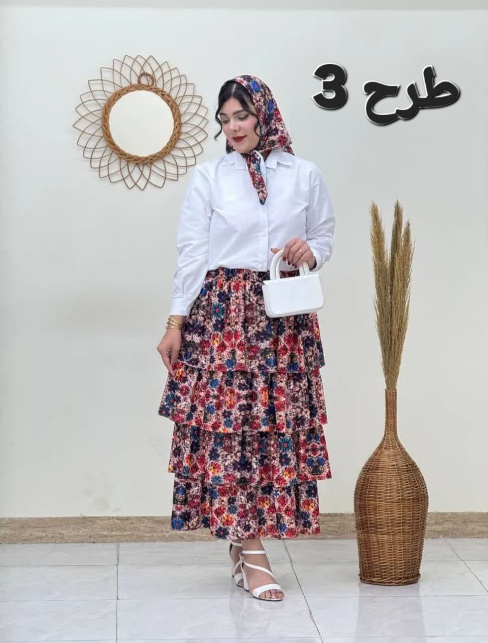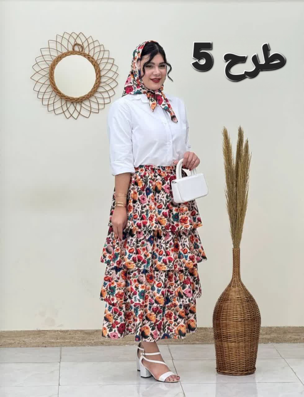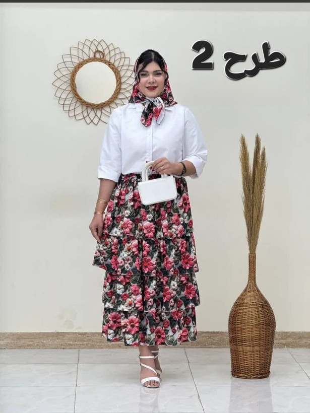 این ست ترکیبی از شومیز خوش دوخت با دکمه های جلو، دامن طبقاتی کمرکشی و روسری خوش رنگ